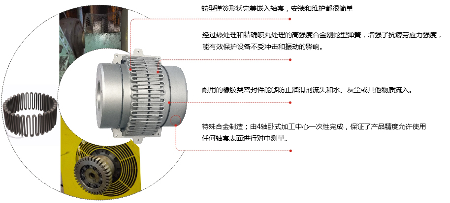 蛇形彈簧聯(lián)軸器的兩齒面是由多個弧形面組成,可根據(jù)載荷的變化來決定齒面的接觸面積,從而可更大的承受載荷沖擊與變化載荷,使起動或載荷不均時更具安全。且能通過彈簧的柔性傳動來吸收大量的振動力,緩沖作用使沖擊振動量降低36%以上,是真正的傳動沖擊過濾器。